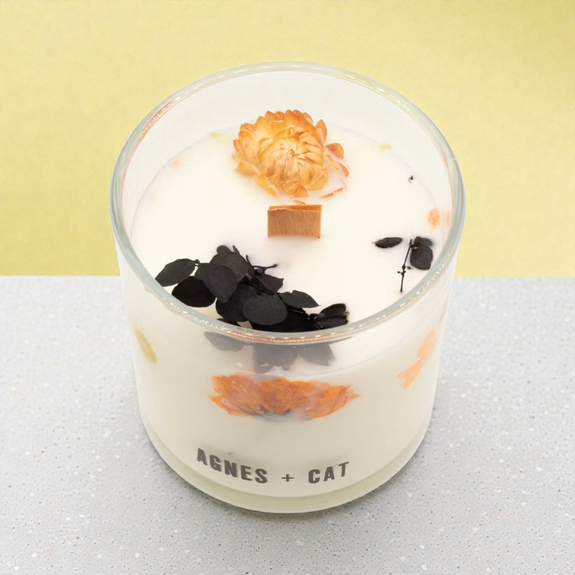 Each candle is hand‑poured using natural soy wax and finished with dried botanicals embedded directly into the wax. These botanicals create a soft, organic glow through the clear glass vessel as the candle burns, giving every piece a unique, natural presence. The wooden wick adds a gentle crackle, deepening the cosy, fireside feel.