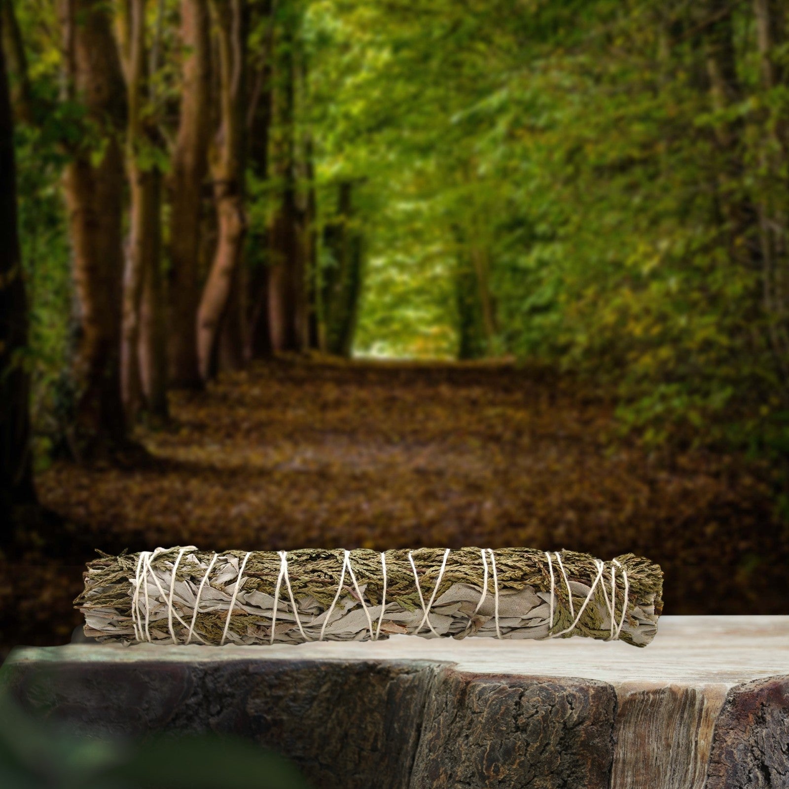 White Sage is traditionally used to clear stagnant energy and invite fresh perspective, while Cedar brings a warm, earthy strength....often used for protection and ancestral connection. Together, they create a deeply aromatic smoke that supports intention-setting, meditation and mindful transitions.