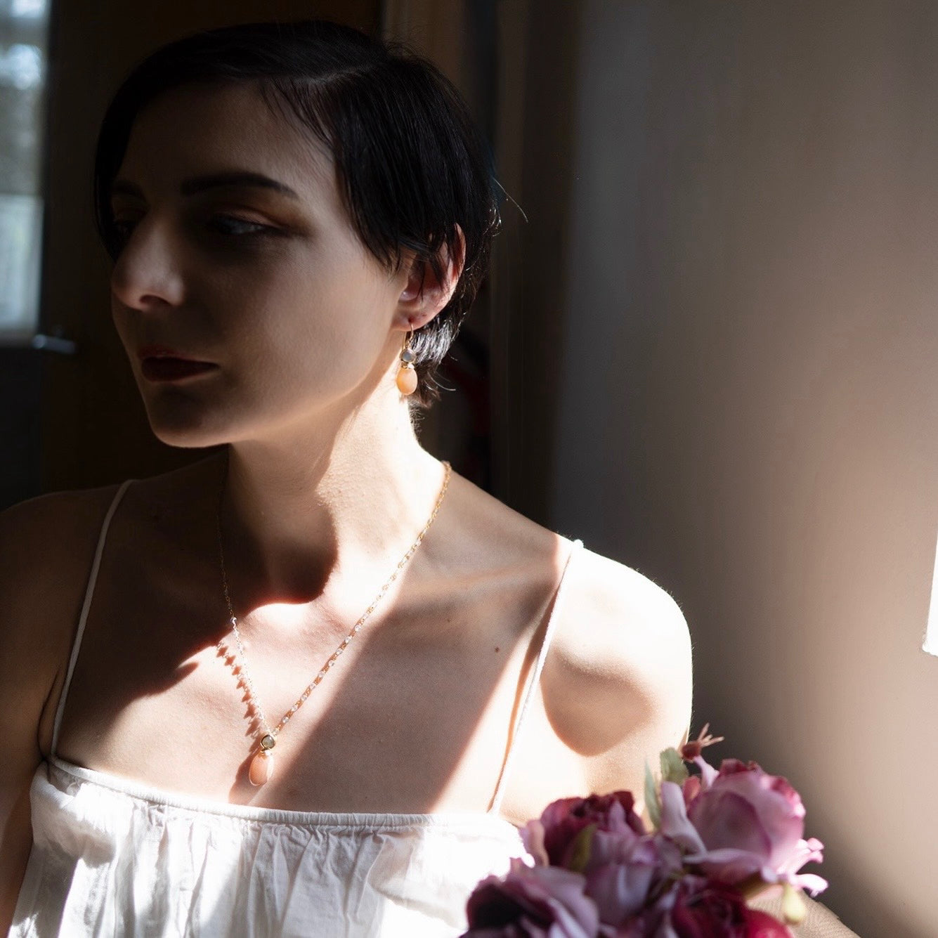 The 30mm pendant evokes the shape of ripened fruit....a rounded gemstone atop a fluid drop - capturing the essence of transformation, emotion and grace. Peach Moonstone brings warmth and feminine energy, while Labradorite offers protection and intuitive depth, making this piece a soulful companion for everyday rituals and seasonal shifts.